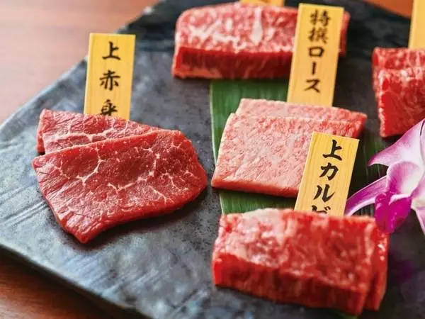 山形県産黒毛和牛「雪降り和牛尾花沢」が看板の店【炭火焼肉神楽坂牛ます】。希少な部位を味わえる盛り合わせや、特撰ロースを紅玉りんごと味わえる名物メニュー『りんご』も見逃せません。