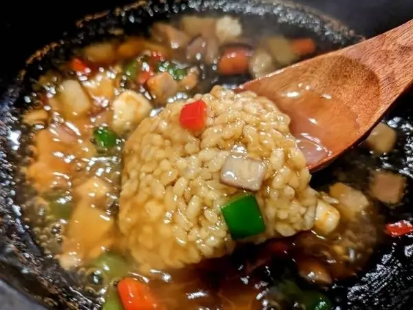 先ほどの赤ワインから変化を付けて軽やかなワインを、という流れに乗って楽しむ料理が、こちらの香ばしい『おこげ』です。1組ずつ、石焼きの器で出していただけるのも嬉しいところ。グツグツと音のする焼き立ての餡には、9種の具材が入っています。メニューを考案していた当初、チャーハンにすることも考えられたそうですが、コースの〆として重くならないようにとおこげにすることに辿りついたのだそう。