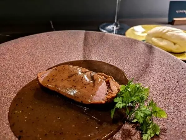 とても柔らかく焼かれた、黒胡椒と赤ワインのソースをかけた盛り付けも美しい牛のフィレ肉です。肉まんの生地にあたる部分でつくられた甘みのあるパンが添えられ、最後の一滴まで一緒に食べたくなります。なおお肉にかかっている黒胡椒のアクセントは、ブラックチェリーを思わせる赤ワインとの相性もピッタリ。また時間が経ちワインが開いてくると合わせるソースや黒胡椒との印象も変わり、食べ進める中でよりわかりやすく変化するマリアージュを楽しむことができる一皿です。