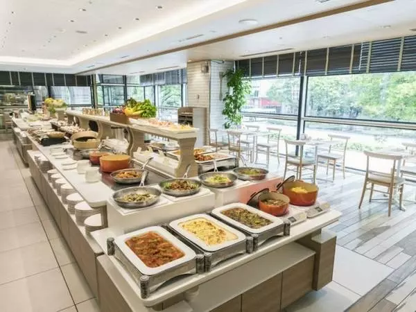 全88席の広々とした店内。開放感あふれる大きな窓から外を眺めながら、心地よくランチタイムを過ごせます。ホテルシェフによる料理実演コーナー「ライブキッチン」ではつくりたてのおいしさを堪能。女性に人気のスイーツはもちろん、キッズカレーなど子ども向きのメニューもあり、家族でちょっと贅沢したい日にもオススメです。