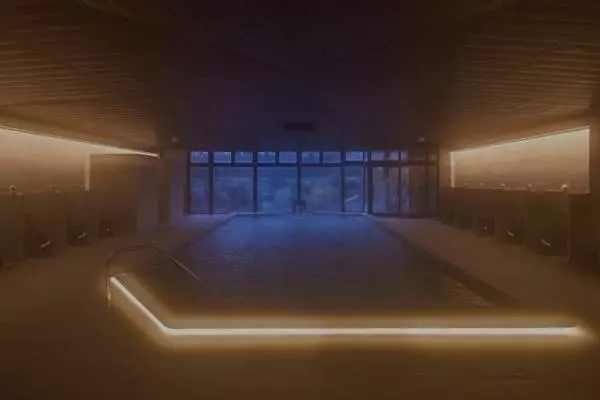 間接照明のみの大浴場は、モダンで落ち着いた雰囲気。サウナや水風呂もある