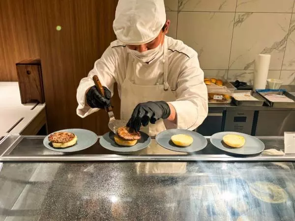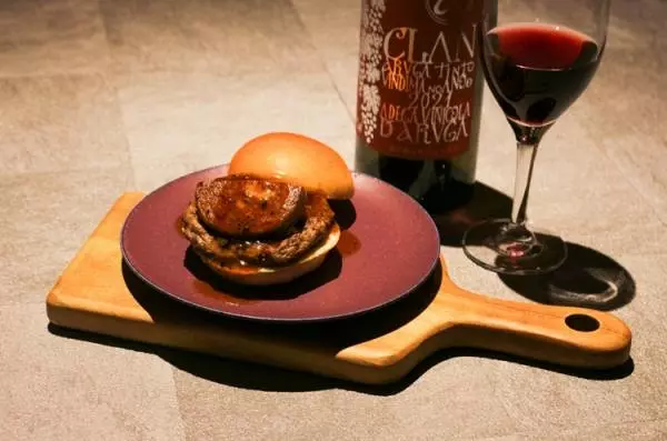 焼きたての100%ビーフのパティと、サステナブルへの取り組みのなかで開発されたグラフォア(チキンレバーベースの素材)を、クリーミーなマッシュドポテトとサンドしたロッシーニ風ビーフバーガーも必食。これには「アルガーノ・グラン」とのマリアージュを。柔らかいタンニンが、お肉のワイルドな旨みをやさしく包み込みます。