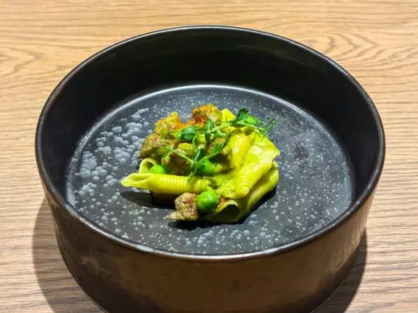 エミリア・ロマーニャ州にある街、イーモラの伝統料理である筒形パスタを、春らしいグリーンピースのソースで仕上げています。グリーンピースは、国産のものより数段甘みが強いイタリア産のものを使用。セミドライトマトと、千葉県産イノシシのサルシッチャと合わせます