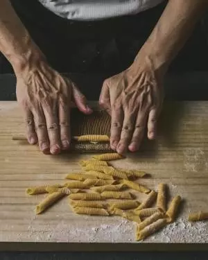 ショートパスタは伝統に倣い、古い木製の溝つき板を転がして成形する