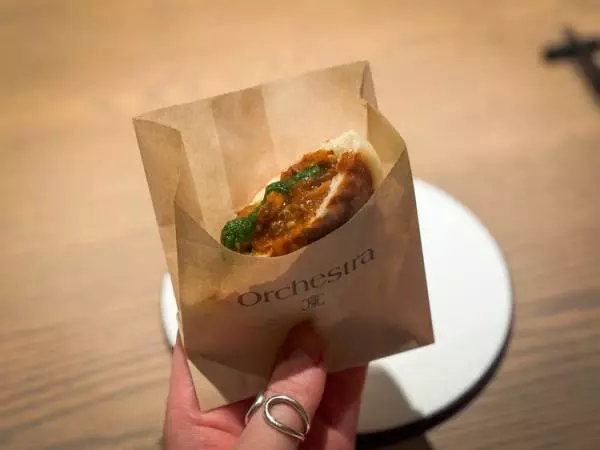 蒸しパンの中に豚の角煮を入れる長崎の「角煮まん」をオマージュし、中には仔牛すね肉の煮込み料理「オッソブーコ」というミラノの代表的な料理を入れた小川シェフならではの一品