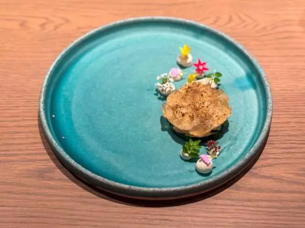 お皿の水色とのコントラスト、蓮の花が浮かぶような印象の美しい一皿