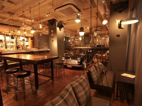 中央にミニクーパーがディスプレイされ、ブランコタイプのカップルシートも用意するなど、こだわりの詰まった店内。オールクッションのラグジュアリーな個室で過ごす時間も格別です。接待の日は完全個室を予約すれば安心して会話ができます。オシャレなテラス席もあるので、気候のいいシーズンに訪れてみては。