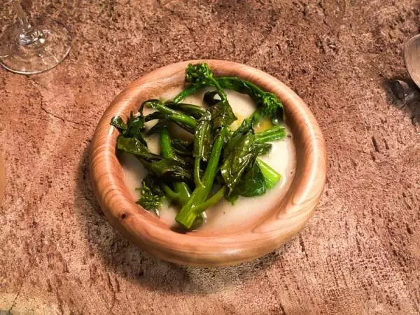 同じく「HOMEMAKERS」から届いた菜の花に、白インゲン豆をペーストにしたスープです。新鮮な菜の花のポリっとした食感に、スープの塩味は丸みを帯びながらもしっかりしていて、ワインが進みます。同店のお隣【パン屋塩見】のカンパーニュをつけていただいてもよし。