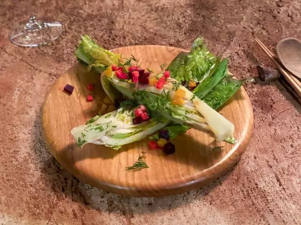 ここで料理がスタートします。料理は基本的にプラントベースで構成しているそう。これは香川県・小豆島にある「HOMEMAKERS」から届いたレッドロメインレタスを使ったサラダで、レモンのドレッシングであえています。そこにオレンジを煮詰めたソースと、小さな賽の目のお野菜は紅くるり大根、ビーツのピクルス。芯まで甘いロメインレタスを箸で取り、頭からシャクっと噛み締めると喜びもひとしおです。