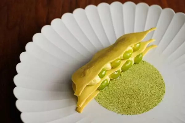 フランスでは冷凍のものは手に入るけれど、フレッシュないいものはないとのこと。この時期に手に入るぷっくりとした枝豆は、フレッシュな香りと、まるい甘みを活かし、可愛らしいミルフィーユになって登場します。