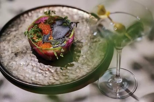 【エンバ・キョウト・チョップハウス】が提供するのは、豪快な大皿に盛り付けた料理だけではありません。まるでブーケのように緻密に盛り付けられた『エンバクラブケーキ 国産ずわい蟹 ハーブ レモン風味のタルタルソース』はフォークを入れるのを躊躇してしまいます。ドリンクもワイン、ウイスキー、日本酒など多彩にラインアップ。グラスワインだけでも30種類近く揃うので、ぜひオーダーした料理と相性の良いものやお好みタイプをスタッフに尋ねてみてください。