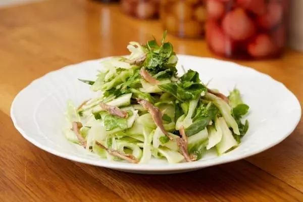 1,900円。独特の風味と苦みをもつローマの野菜「プンタレッラ」を使用したサラダ。プンタレッラ自体のかすかな苦味とアンチョビとの組み合わせもよい。