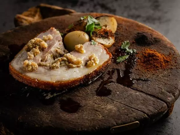 代官山【falo】のシグネチャー料理といえば、バラ肉を巻いた塊をオーブンで30〜40分じっくり火を入れ、最後に豪快に炭火で焼き上げる『ポルケッタ』。これはもともとイタリア・ヴェネチア地方の郷土料理『仔豚の丸焼き』をバラ肉でアレンジした料理で、ローズマリーとニンニク、塩のみというシンプルな味付け。この料理を【falo+】では豚の熟鮓を塗って焼いているのです。