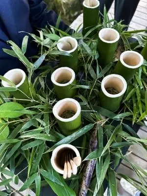 そして竹に入った和え物。これはタケノコとミルク、じゅんさいなどで構成されています。相性のいいやさしい食感で、竹林のイメージ。