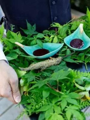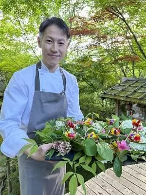 中に入ると、緑豊かな庭に設えられた木のテーブルでウェルカムドリンクが用意されていました。京都発のボタニカルなジン「季能美KI NOH BI 29th Edition ザ・リッツ・カールトン京都開業10周年記念ジン」でつくられた爽やかなカクテルです。小鳥の囀りを聞きながらそれをいただいていると、井上シェフがブーケを持っての登場。いや、これが最初のアミューズでした。