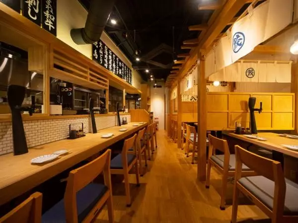 緑のネオン管がひときわ目を引くエントランスが印象的な店構え。店内は木のぬくもりが感じられるくつろげるつくりになっていて、デートで使う人も多いのだとか。レモンサワーのサーバーは、テーブルだけでなくカウンターにも設置されているので、どこに座ってもおいしいレモンサワーをたっぷりと味わえます。