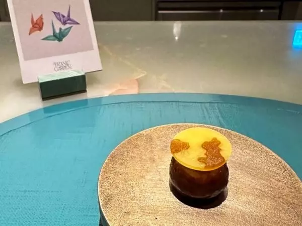 チュワクという伝統菓子をアレンジした一口サイズのアミューズです。からすみやコンテチーズでつくられたモチモチのもの、チャプチェ風の野菜、揚げたじゃがいものなかにユッケ入ったもの、鶴の形をした海苔の菓子。それぞれに温度や食感が面白く、手が凝っています。