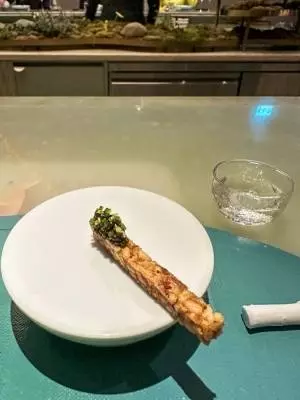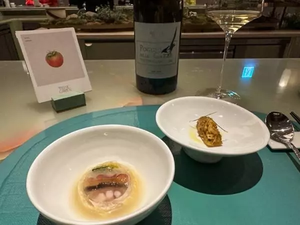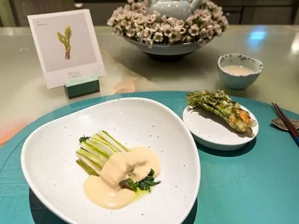 タラの芽の絵とともに2種類の料理が用意されました。手前は炭火焼きしたタラの芽の冷菜で、奥は海老がつまった天ぷらです。松の実と味噌でつくられたソースが香ばしいドレッシングになっていて、春っぽい爽やかさを感じます。