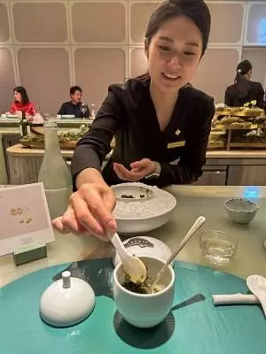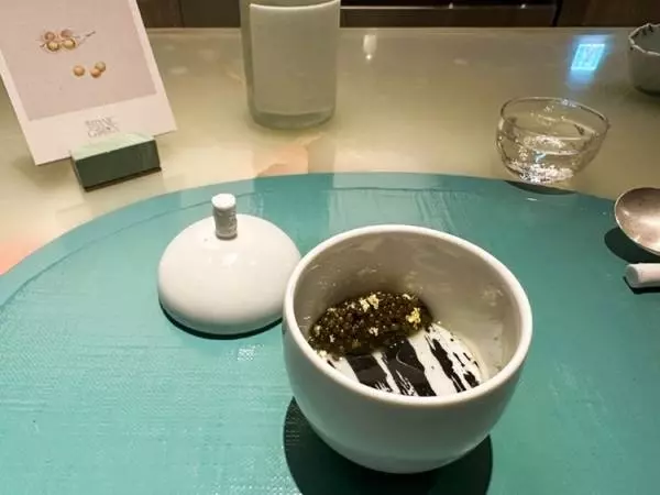 次は豆を使った茶碗蒸し風の料理にキャビアが乗せられています。韓国でつくっているキャビアだそうです。ソムリエが合わせてくれたのは瑞雪という焼酎。ギンギンに冷やして雪を噛むような感じで合わせてほしいと。これもなかなか面白いペアリングです。