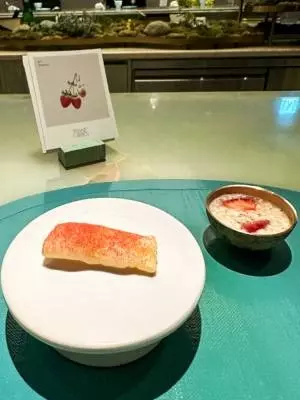 デザートはユグァというお菓子とシッケという発酵米のジュースです。シッケには苺が使われています。