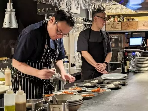 料理をふるまう【meso】のオーナー桑原大輔さん(右)と、シェフの原島正幹さん(左)