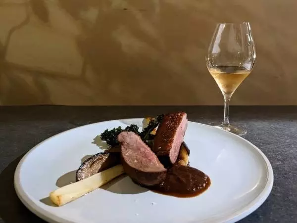 これまでシェフが調理してきた鴨料理に比べ、さらに鴨の柔らかさを出した状態に仕上げたいと、オレンジや八角、コリアンダーなどのスパイスの中に20分間ゆっくり漬けて寝かせているそう。漬け込んだあとには軽く表面を揚げる手法で皮目にパリッと感を出し、食べやすく香ばしい一品となっています。椎茸と長ネギをベースにバルサミコやオレンジをいれて構成したソースと、アクセントにケールのチップを添えて。