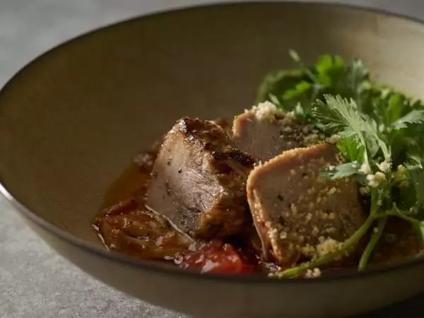スパイス、フルーツなどで漬け込んだ豚肉をラードでじっくり煮込む南米料理のカルニータスをもとに、中国たまり醤油や昆布だしなどを加えアレンジしたポーク煮込み。