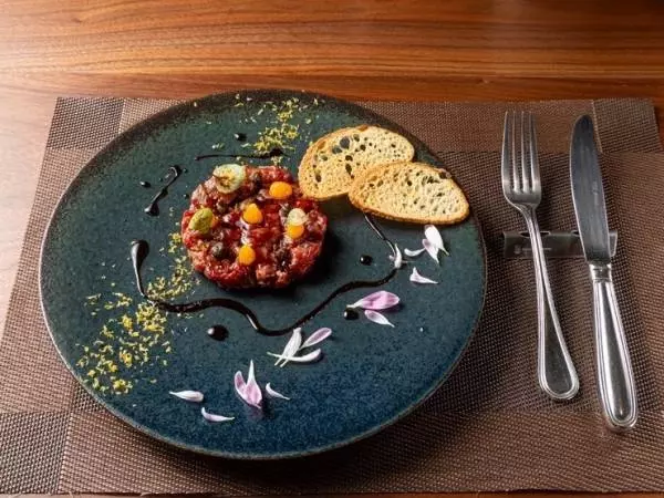 『黒毛和牛内もものタルタル、フォンドヴォーと卵黄のソース』