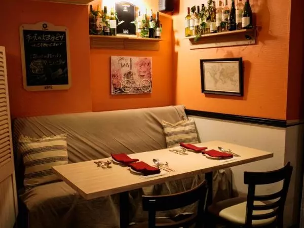 入り口横にワイン樽やユニークなイラストが置かれたシンプルなエントランスから店内へ。落ち着いた雰囲気の空間にはR&BがBGMとして流されています。テーブル席には、ソファを設置したところもあるなど、リラックスしておいしい食事を楽しめるようになっています。