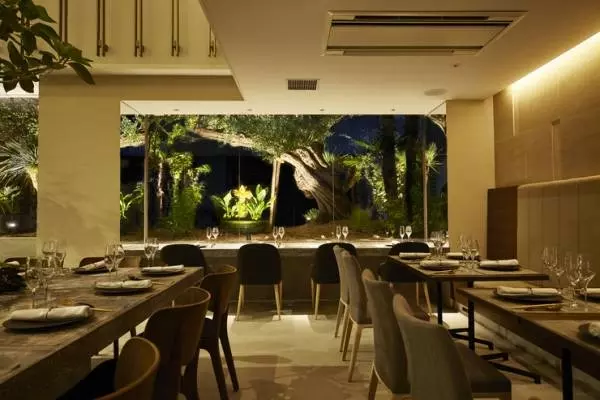 大阪メトロ本町駅から徒歩5分、靭公園のすぐ近くにある中国料理店【熱香森 -LA SHANG SEN-】。靭公園より「延長された深緑」がコンセプトで、店の周りには樹齢300年以上というオリーブの木が植えられており、緑豊かなエリアとの一体感が印象的です。