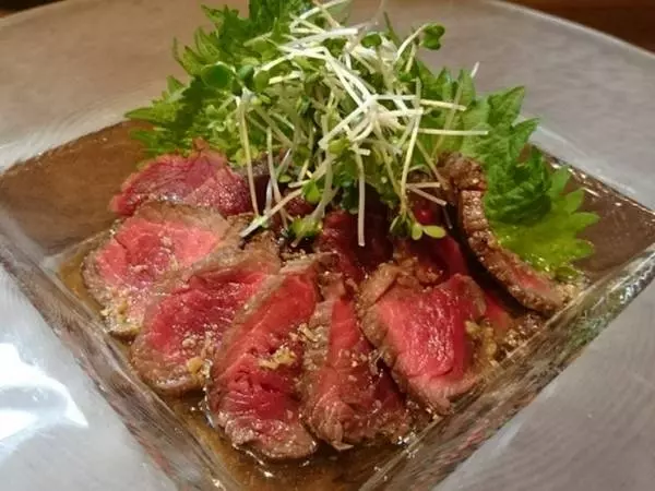 ニンニク醤油ジュレが味を引き立てる『山梨県産ダチョウのタタキ』