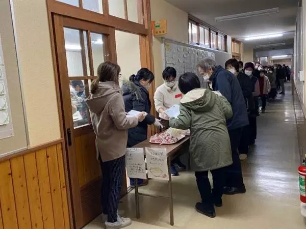 避難所の小学校で炊き出しの列ができている様子