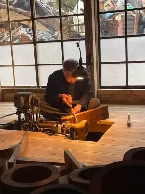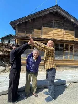 そのこのギャラリーの展覧会をしたときに娘さんを誘って僕が連れてきたんですけど。その関係で建築家仲間が、輪島の様子をボランティアでお手伝いしようと来られたんです。木地屋さんの工房にご案内して、ここを再建したいと相談して。たぶん10人の内9人の大工さんは無理だっていうなかでも、この中の大工の棟梁が赤木さんという僕と同じ名前なんですが「この家は小屋組がしっかりしてて、柱は折れてるけどもちあげれば何とかできる」と言ってくださったんです。ざっくり見積もって1000万円弱でできるとのことで、僕はSNSを通じて寄付を集めたりっていうのは得意じゃないというか好きじゃないのですが、やむを得ず1回呼びかけたら一気に1,500万円くらい集まって、プロジェクトを始めて2カ月くらいでほぼ仕上がりました。桜の花が咲いた4月中旬頃には、池下さんが避難していた加賀温泉から戻ってきて、仕事を始めようというところでまた不全の発作を起こして入院したのですが、2週間で退院して今は元気に仕事をしています。