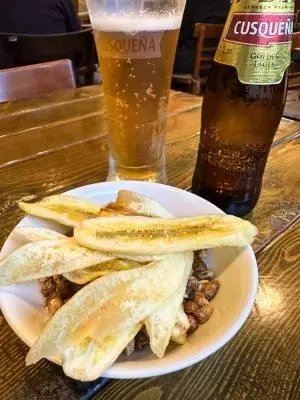 おつまみはチフレ(バナナ)、カンチータ(トウモロコシ)の2種盛りです。バナナを揚げたものに塩のきいた乾燥トウモロコシは、まさにこのビールのためのスナックのようです。