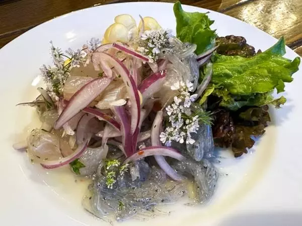 そしてセビーチェ。湯河原らしくヒラメと生しらすが使われています。地元の日向夏であえてあり、心地よい酸っぱさが後を引きます。