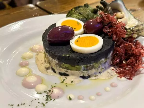 ポテサラ同様にカウサ・レジェーナにもいろんなバリエーションがあります。今回登場したのはイカ墨入りのもので、真鶴のサザエもふんだんに使われています。独特の食感と海の香りのする一皿になっています。