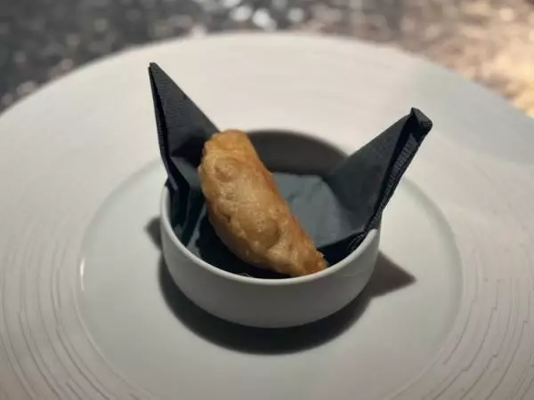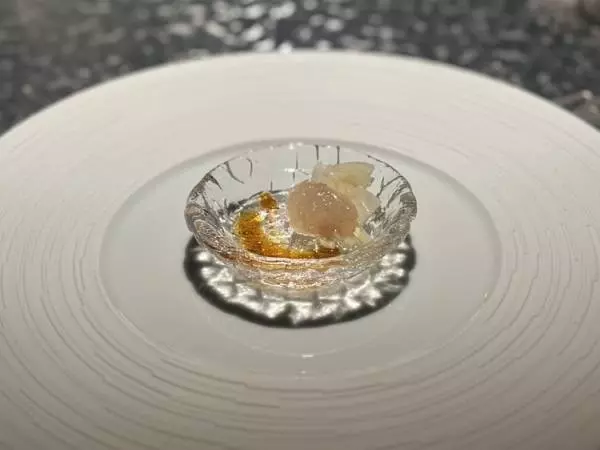 【サンパウ】出身のシェフだからこそ、スペイン料理をオマージュして毛蟹はタパス仕立てで登場します。まずはむき身を、瀬戸内でつくられた魚醤とフェンネル(ウイキョウ)の芽と合わせて。プリップリの身に、すだちの爽やかとラベンダーオイルが華やかに香ります