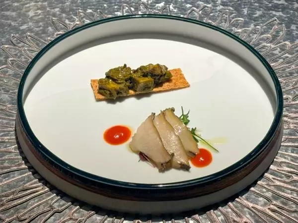 黒鮑を使用した冷たい前菜。奥がシンプルな肝和えで、手前はハーブ、イタリアンセロリ、ミニオゼイユ、オキサリスなどのハーブと合わせていただきます。旨み、食感ともに最高です