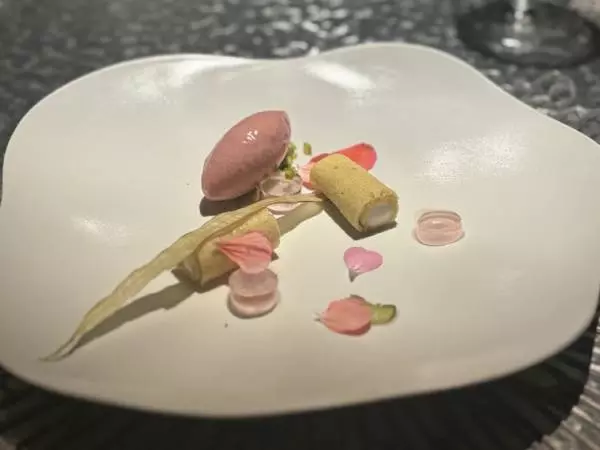 旬のルバーブを使ったデセール。ルバーブをフレッシュ、ゼリー、シャーベットなど異なる食感にそれぞれ仕立てていて、その爽やかな酸味とローズゼラニウムの香りが印象に残ります