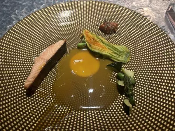 魚料理はトキシラズ。春から夏にかけての季節外れに北海道で獲れる鮭です。皮はバリッと、身はミキュイに仕上げられ、シャープな印象の脂がしっかり乗り、身もフワフワで絶品です。付け合わせには福島県産のズッキーニとアスパラガス
