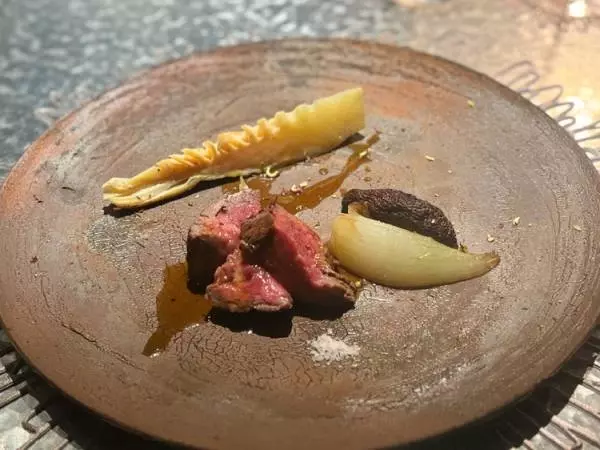 メインのお肉は、年間10頭ほどしか出回らない宮崎県産の「竹の谷蔓牛」、23ヶ月の経産牛です。テールを煮詰めたシンプルなソースと、上からぶどう山椒を散らしています。付け合わせには、アク抜き不要で柔らかく旨み抜群の白子たけのこと、肉厚の小椋(おぐら)しいたけ