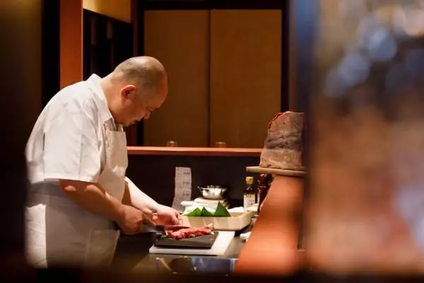 料理人歴45年の大ベテラン、岡﨑睦料理長。15の歳からこの道一筋。鮨に天ぷら、そして肉とさまざまなジャンルに精通してきた