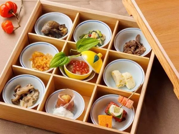 コースの中の一品『匠膳』は、仕切られた箱の中に彩りよく旬が並ぶ