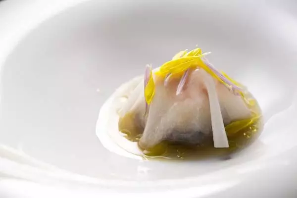 魚料理の一例『サワラの腹身ミキュイ炙り焼き、塩レモンと冷燻オイル』