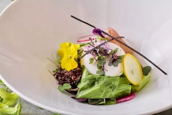 ①シーザーサラダをイメージしたポーチドエッグと夏野菜のサラダ