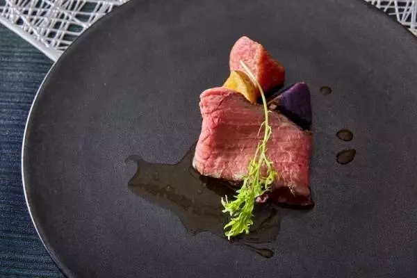 ⑤ストリングスホテルオリジナルローストビーフ吟醸酒と塩麹のソース、北海道産3色カラフルポテトを添えて