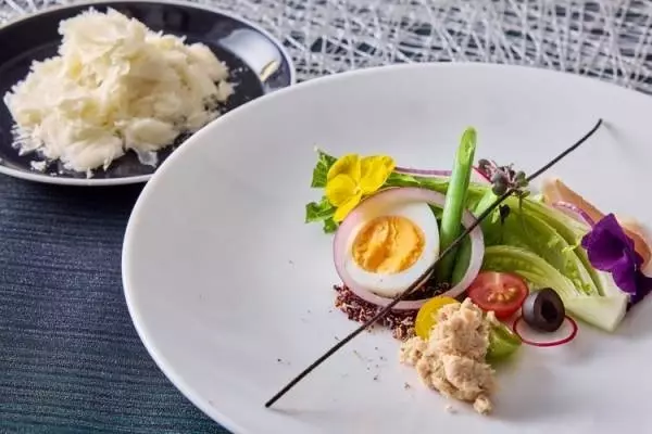 ①ニース風サラダをイメージした生ハムと彩り野菜のサラダラスパドゥーラチーズをのせて
