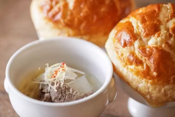 ②牛筋ときのこ、トゥベッティを入れた生姜風味のヘルシーパイ包みスープ