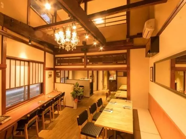 築110年以上の古民家をリノベーションした2階に居を構える【cucina NUMMAクチーナ・ヌンマ】。大きな梁やシャンデリアが特徴で、落ち着いた雰囲気です。窓際の横並びカウンター席のほかに、ソファ席も。さらには半個室や座敷個室も完備。20名〜貸し切りも可能で、立食スタイルであれば30名ほどが利用可能です。