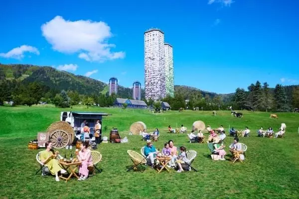北海道内のビール醸造所5社と共同開発したオリジナルクラフトビールを、約100ヘクタールの広大なファームエリアで楽しめるイベント「ファームクラフトビアガーデン」を開催。3回目の開催となる2024年は、IPA(インディア・ペールエール)にファーム星野(*1)で生産した「トマム牛乳(*2)」を合わせたクラフトビール「MILK HOP」が登場。ビールのお供には、ビールの原料であるホップを使用したおつまみ『ホップコーン』を提供します。
